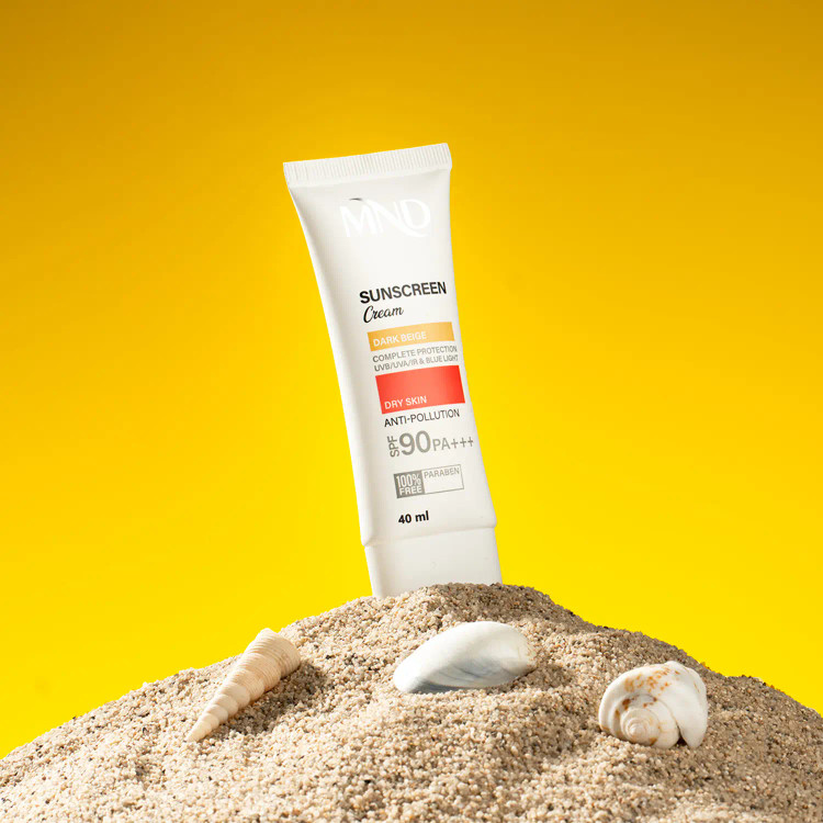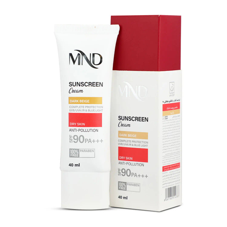تابش طولانی مدت نور خورشید به پوست، یکی از عوامل پیری زودرس پوست است. در اصل اشعههای UVA و UVB خورشید با ایجاد رادیکالهای آزاد در پوست، موجب آسیب دیدن ساختارهای حیاتی پوست شده و ایجاد لک و چین و چروک را تسریع میکنند. همچنین تحقیقات علمی اخیر نشان دادهاند که طیف مادون قرمز ساطع شده از خورشید و نور آبی منتشر شده از لوازم الکترونیکی (رایانه، گوشی همراه، ...) هم در آسیب دیدن پوست نقش دارند، درنتیجه برای تولید یک محصول ضدآفتاب کامل، مقابله با این اشعهها نیز باید مورد توجه قرار بگیرد. این کرم ضدآفتاب MND با فاکتور حفاظتی 90، بهصورت فاقد پارابن، به رنگ بژ تیره و مناسب برای پوست خشک تولید شده و با بهرهگیری از ترکیبات و فیلترهای مناسب قادر است مانع صدمه دیدن پوست توسط اشعههای فوقالذکر شود.