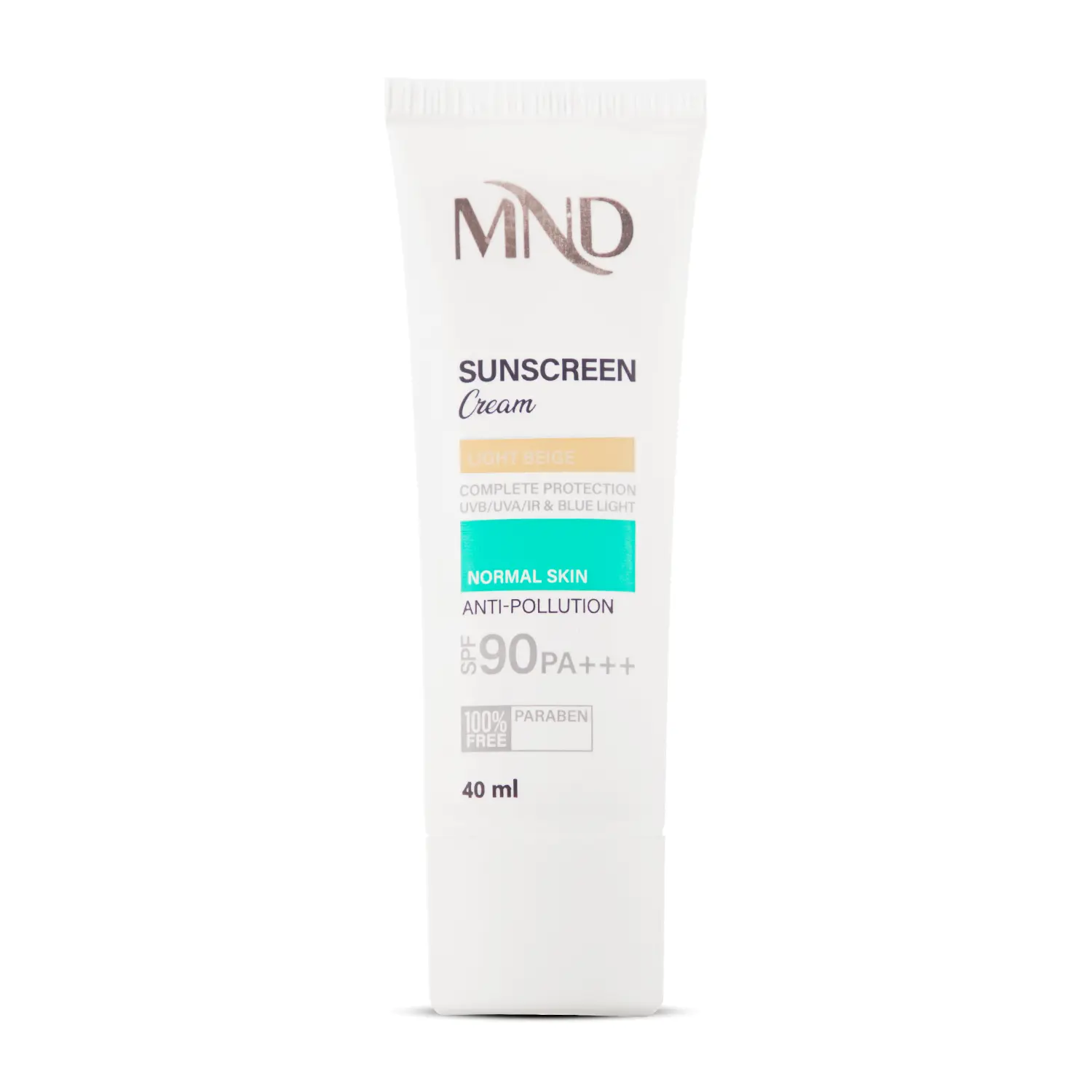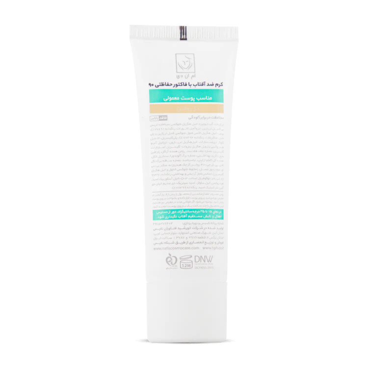 تابش طولانی مدت نور خورشید به پوست، یکی از عوامل پیری زودرس پوست است. در اصل اشعههای UVA و UVB خورشید با ایجاد رادیکالهای آزاد در پوست، موجب آسیب دیدن ساختارهای حیاتی پوست شده و ایجاد لک و چین و چروک را تسریع میکنند. همچنین تحقیقات علمی اخیر نشان دادهاند که طیف مادون قرمز ساطع شده از خورشید و نور آبی منتشر شده از لوازم الکترونیکی (رایانه، گوشی همراه، ...) هم در آسیب دیدن پوست نقش دارند، درنتیجه برای تولید یک محصول ضدآفتاب کامل، مقابله با این اشعهها نیز باید مورد توجه قرار بگیرد. کرم ضدآفتاب SPF 90 ام ان دی بهصورت فاقد پارابن، به رنگ بژ روشن و مناسب برای پوست معمولی تولید شده و با بهرهگیری از ترکیبات و فیلترهای مناسب قادر است مانع صدمه دیدن پوست توسط اشعههای