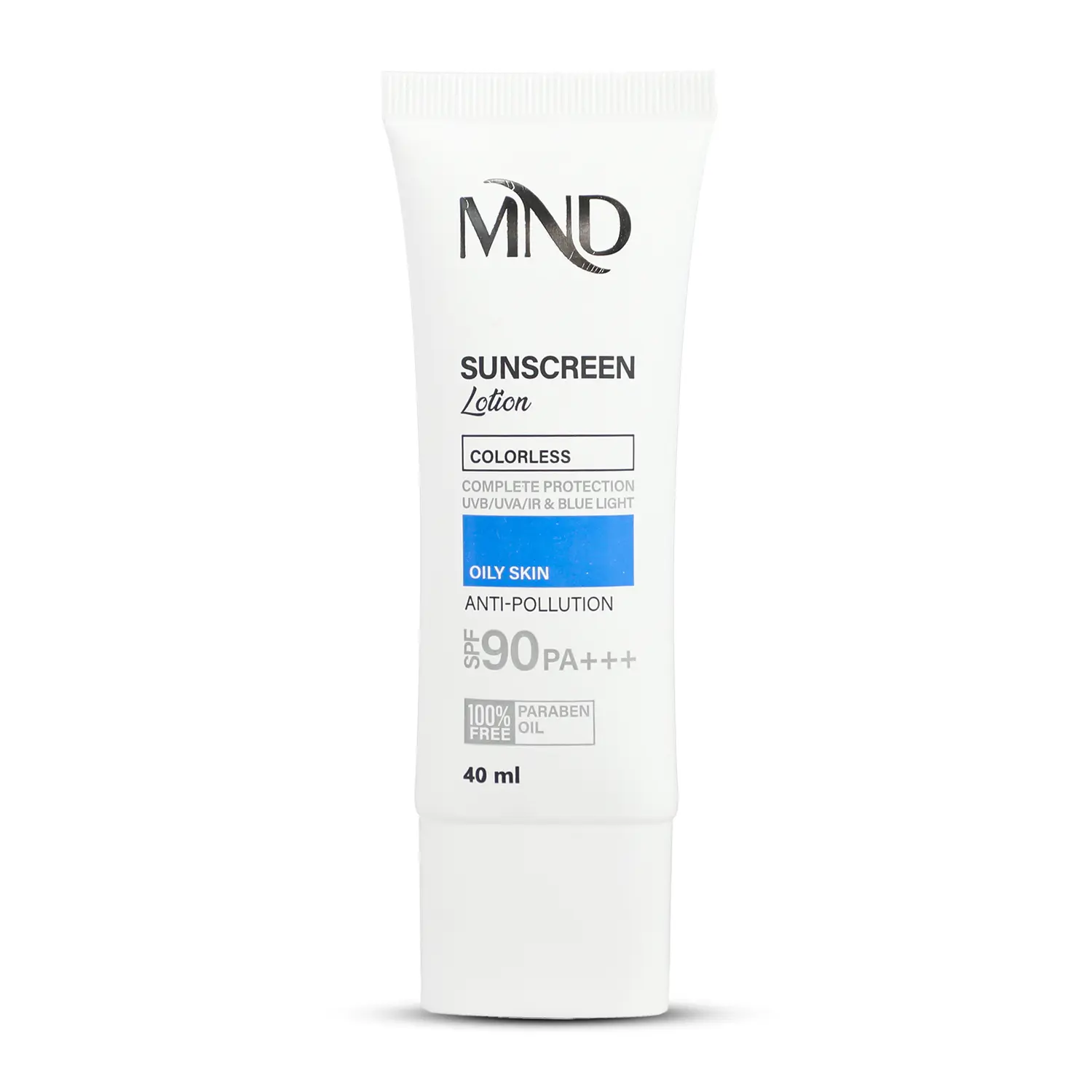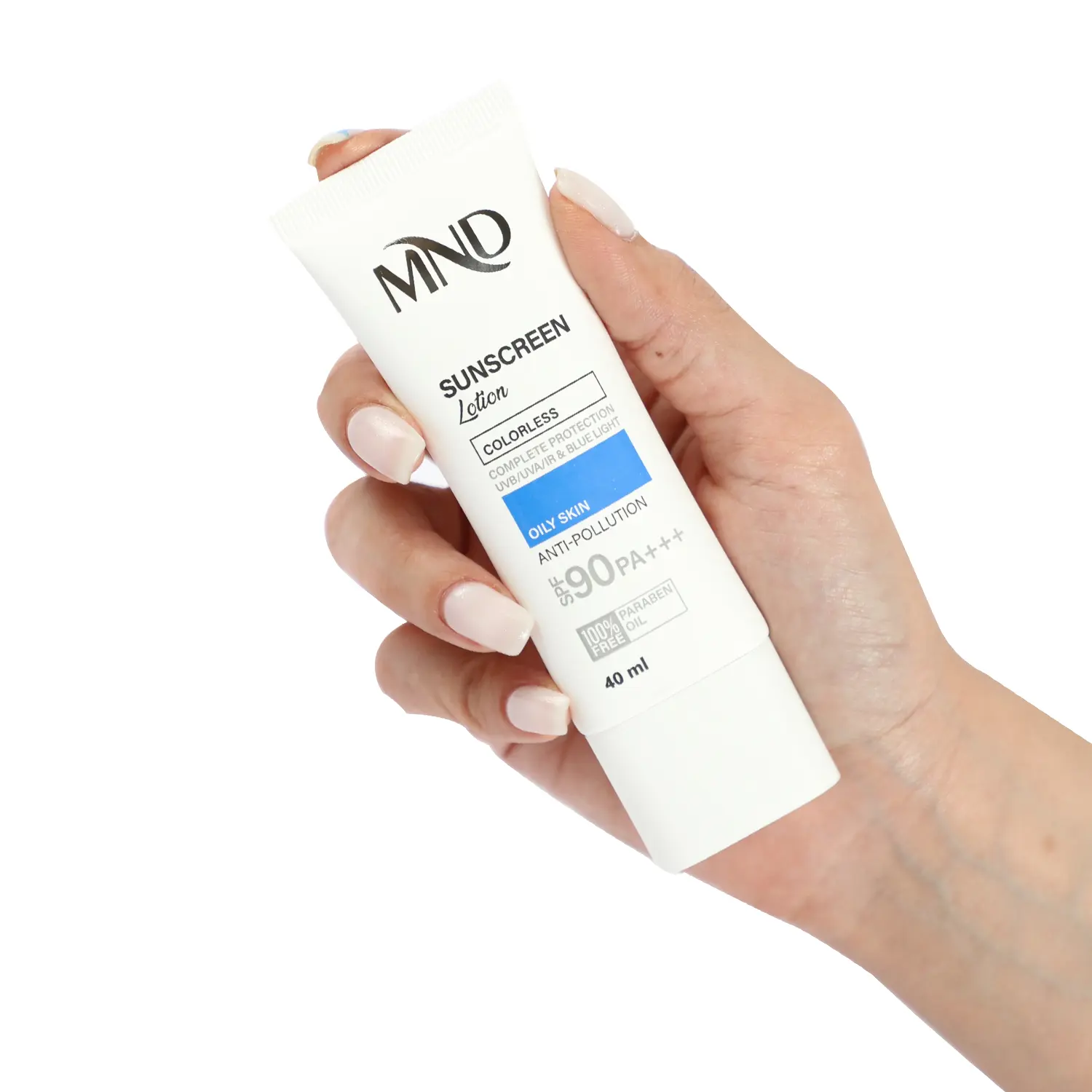 تابش طولانی مدت نور خورشید به پوست، یکی از عوامل پیری زودرس پوست است. در اصل اشعههای UVA و UVB خورشید با ایجاد رادیکالهای آزاد در پوست، موجب آسیب دیدن ساختارهای حیاتی پوست شده و ایجاد لک و چین و چروک را تسریع میکنند. همچنین تحقیقات علمی اخیر نشان دادهاند که طیف مادون قرمز ساطع شده از خورشید و نور آبی منتشر شده از لوازم الکترونیکی (رایانه، گوشی همراه، ...) هم در آسیب دیدن پوست نقش دارند، در نتیجه برای تولید یک محصول ضدآفتاب کامل، مقابله با این اشعهها نیز باید مورد توجه قرار بگیرد. لوسیون ضدآفتاب SPF 90 برند ام ان دی بهصورت فاقد پارابن و روغن، بدون رنگدانه و مناسب برای پوست چرب تولید شده و با بهرهگیری از ترکیبات و فیلترهای مناسب قادر است مانع صدمه دیدن پوست توسط اشعههای فوقالذکر شود.